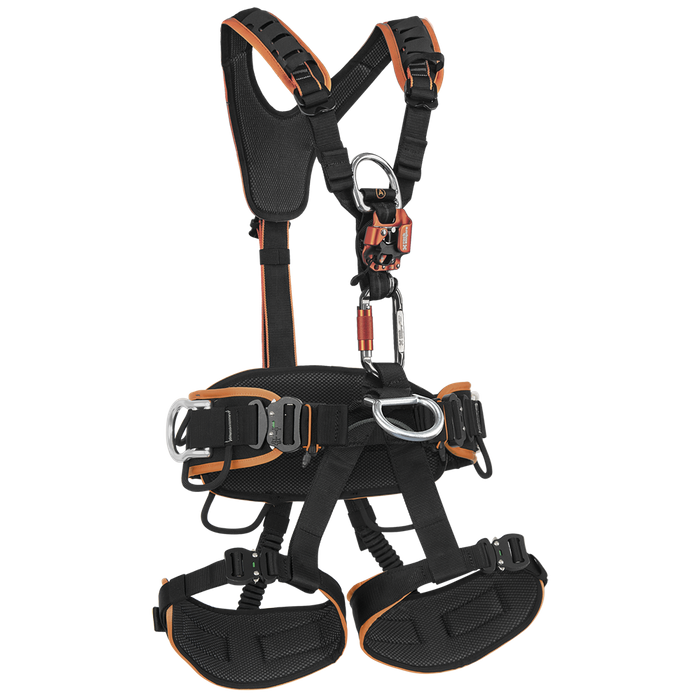 The chest part of the harness is equipped with permanently attached a lightweight and compact chest ascender Chest Up, designed for professional use in rope access systems. Chest Up is unique in that it includes a swivel. The harness is also comfortable thanks to the reinforced padded waist belt and leg straps.